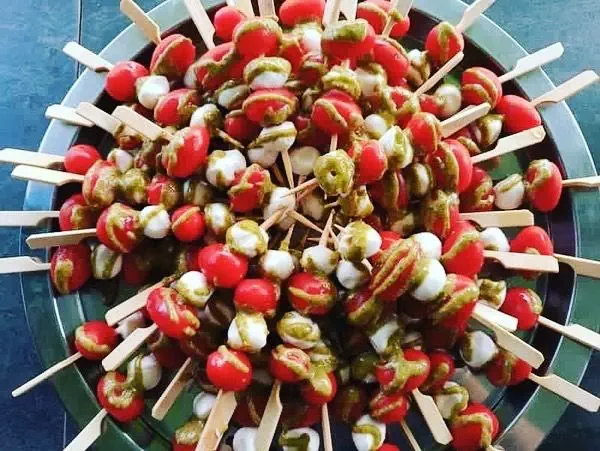 Brochettes de tomates cocktail, billes de mozza et pesto de pistache