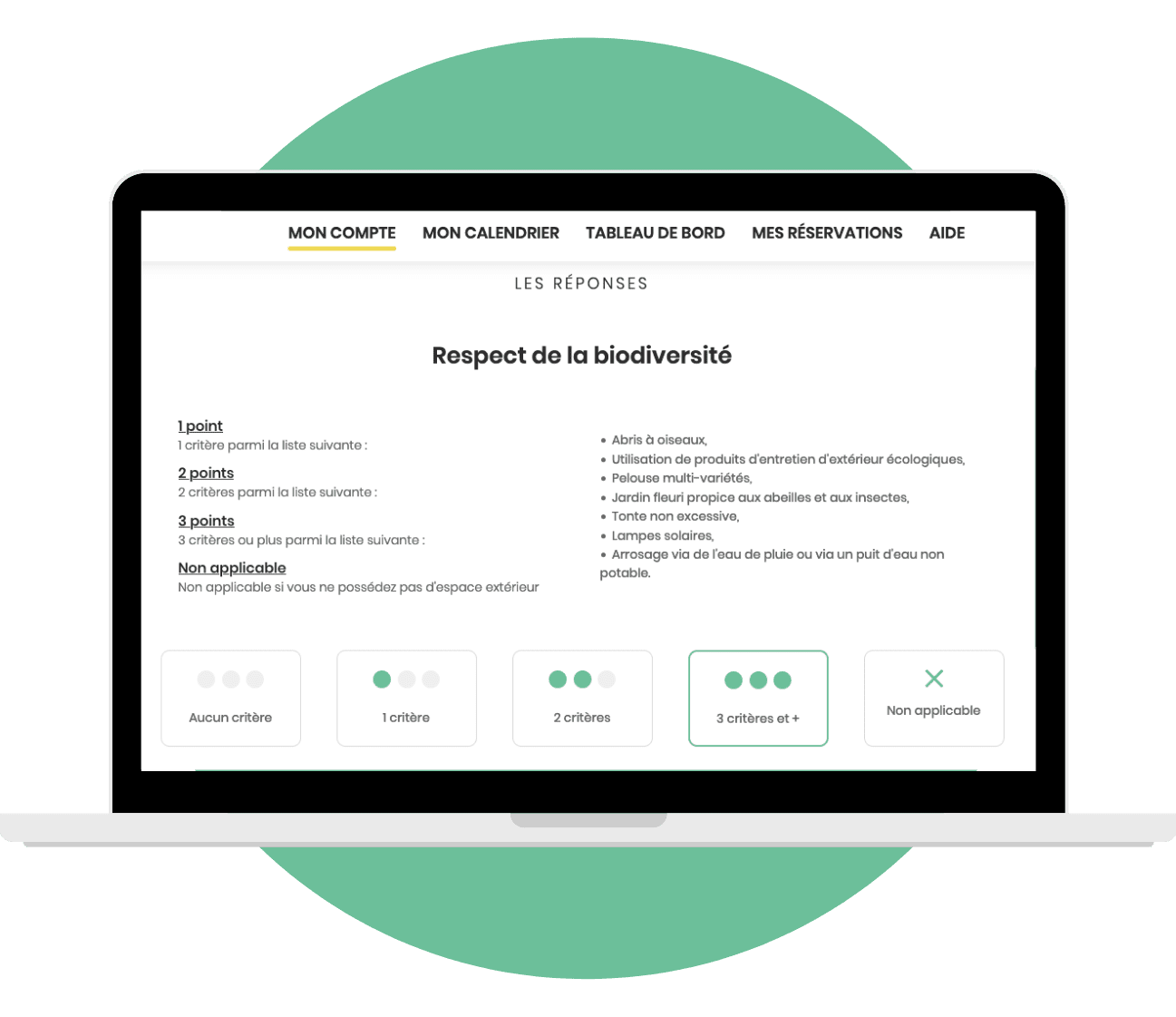 Le principe est simple, pour chaque thématique, nous demandons quels critères environnementaux le prestataire applique déjà. En fonction du nombre de critères, nous calculons un nombre de points allant de 1 à 3.